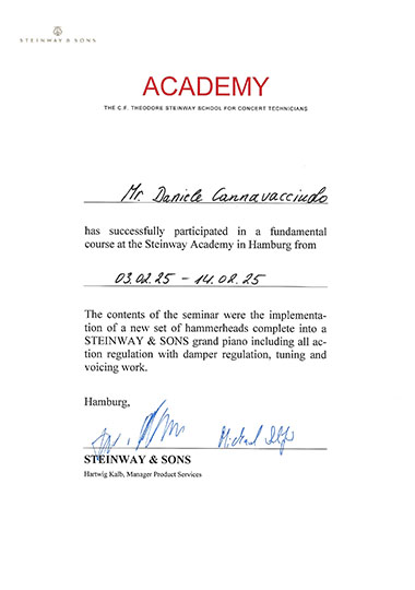 Continued to work with his great teacher, his father Francesco Cannavacciuolo (tuner technician with 50 years of experience in the field of pianos).
